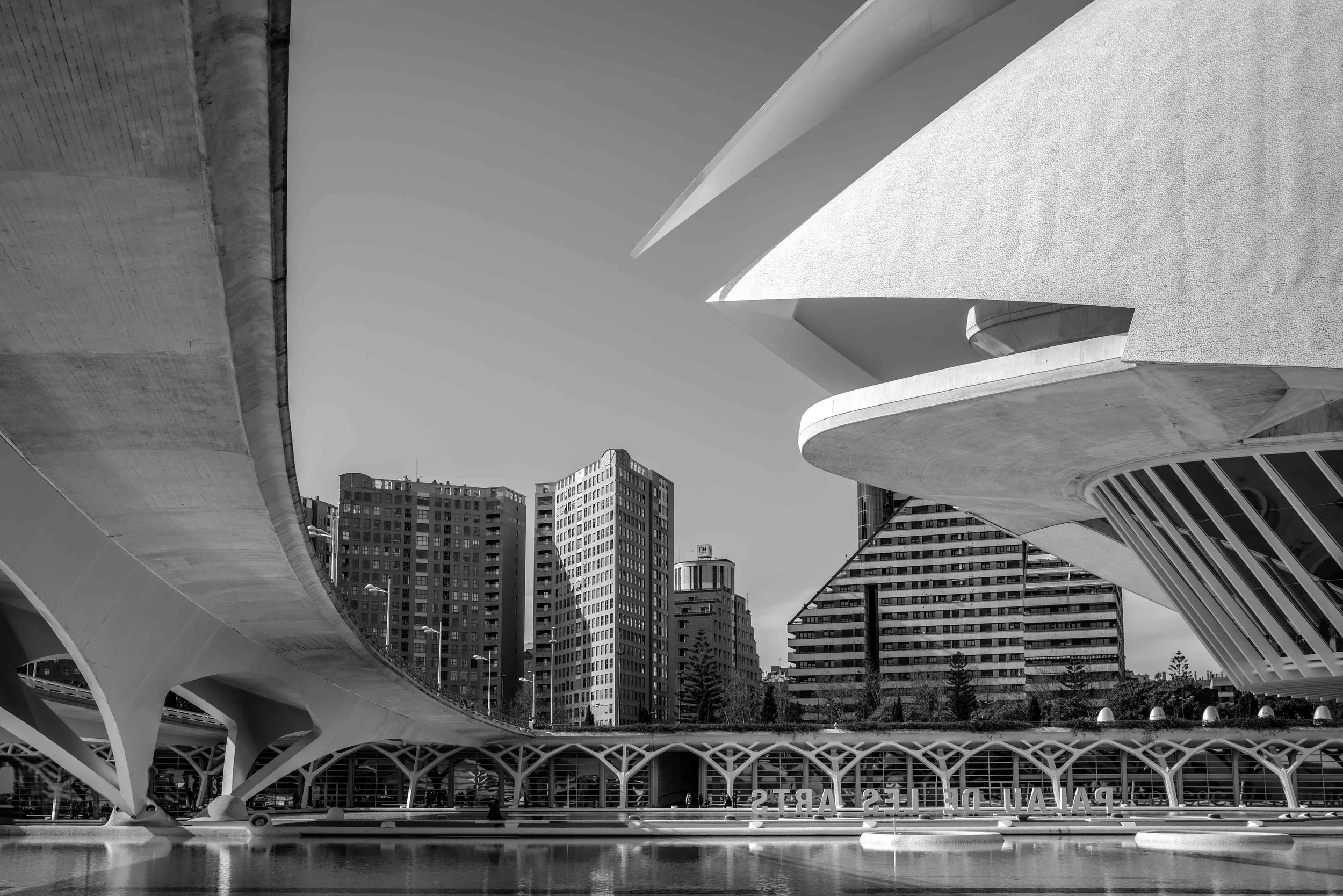 Valencia Calatrava: zwart-wit foto van moderne architectuur met opvallende gebogen en hoekige gebouwen, een waterpartij en een overdekte wandelweg in een stedelijk landschap.