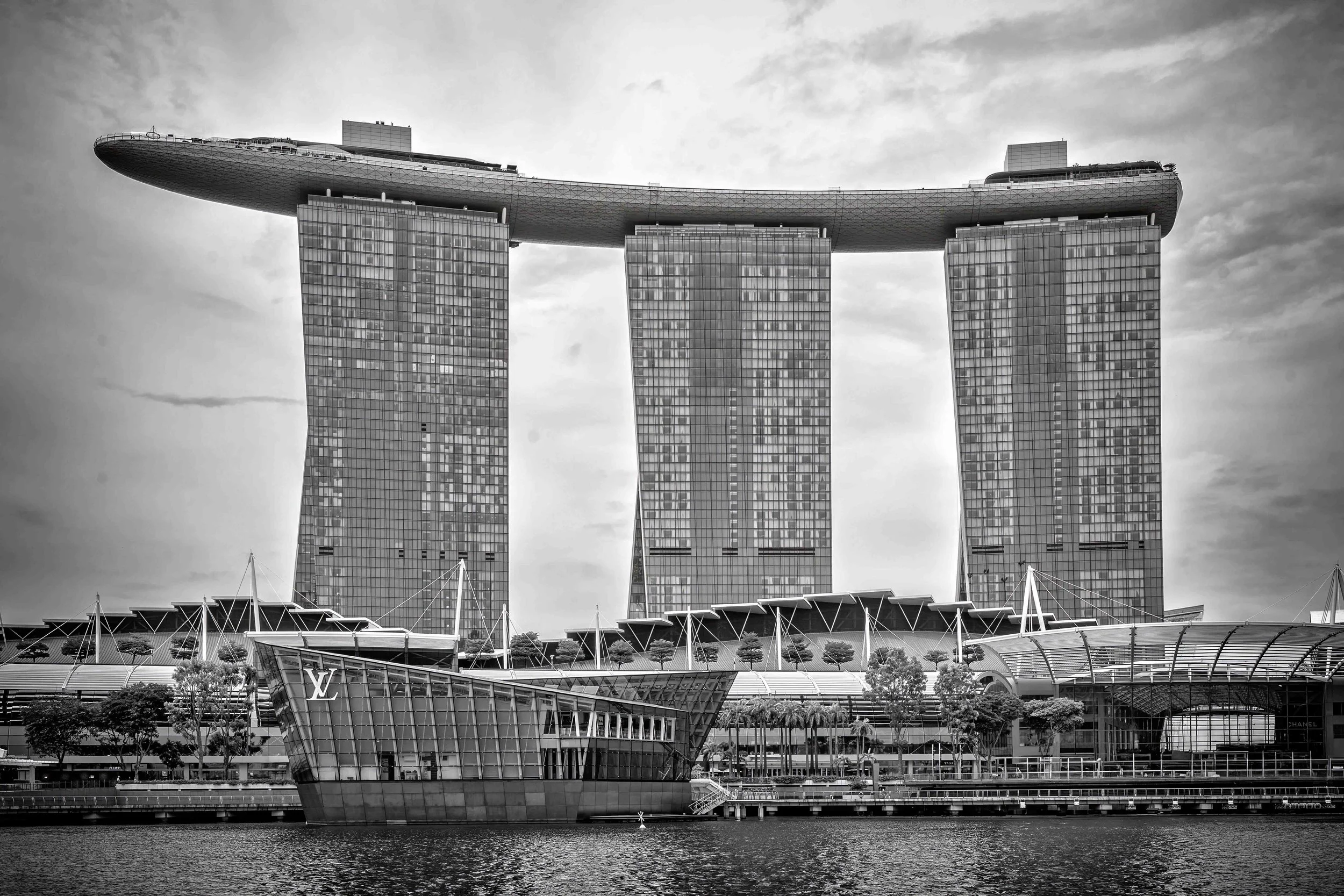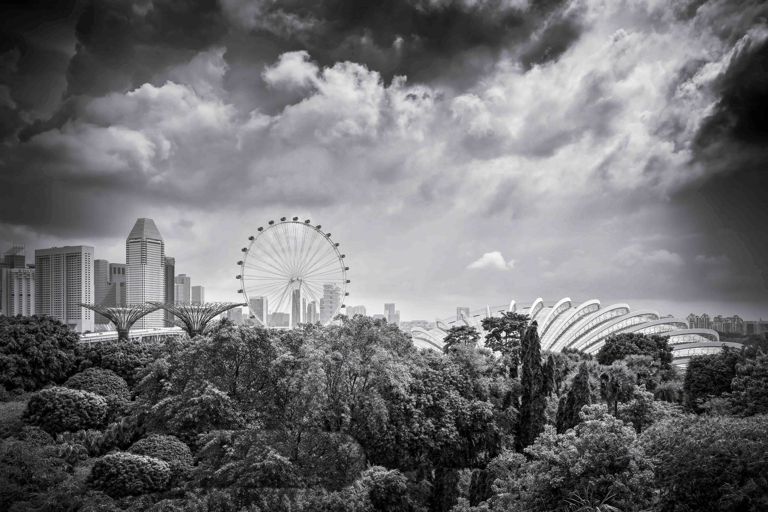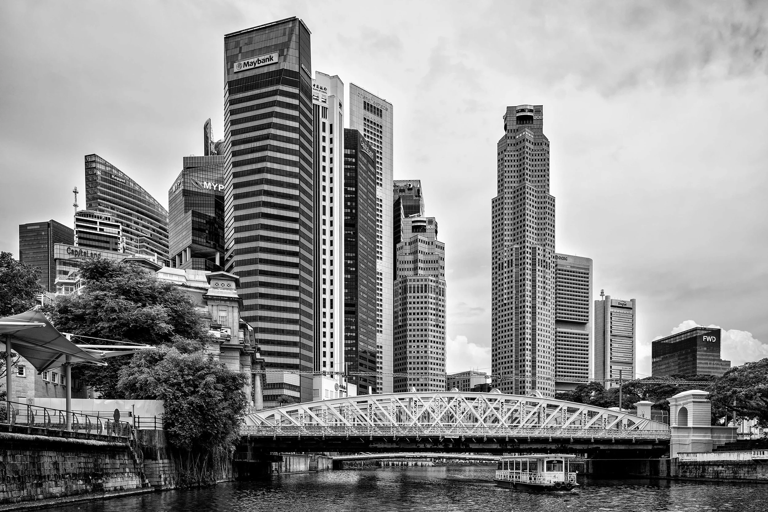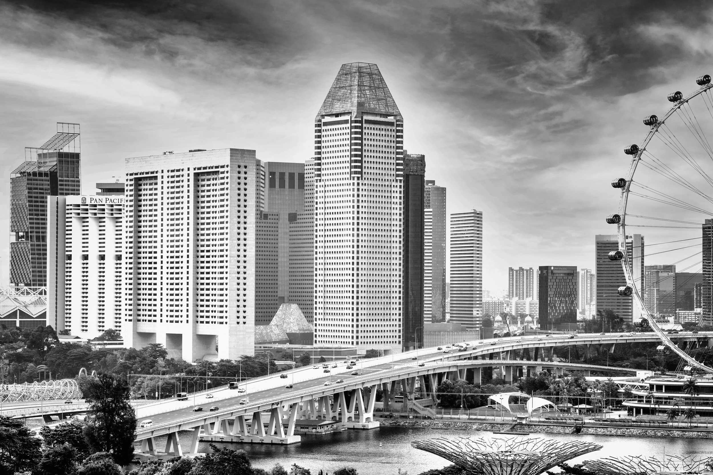 Een fotodocumentaire in zwart wit over het stedelijke landschap van Singapore in juli 2024. Een adembenemende afwisseling van architectuur en natuur.